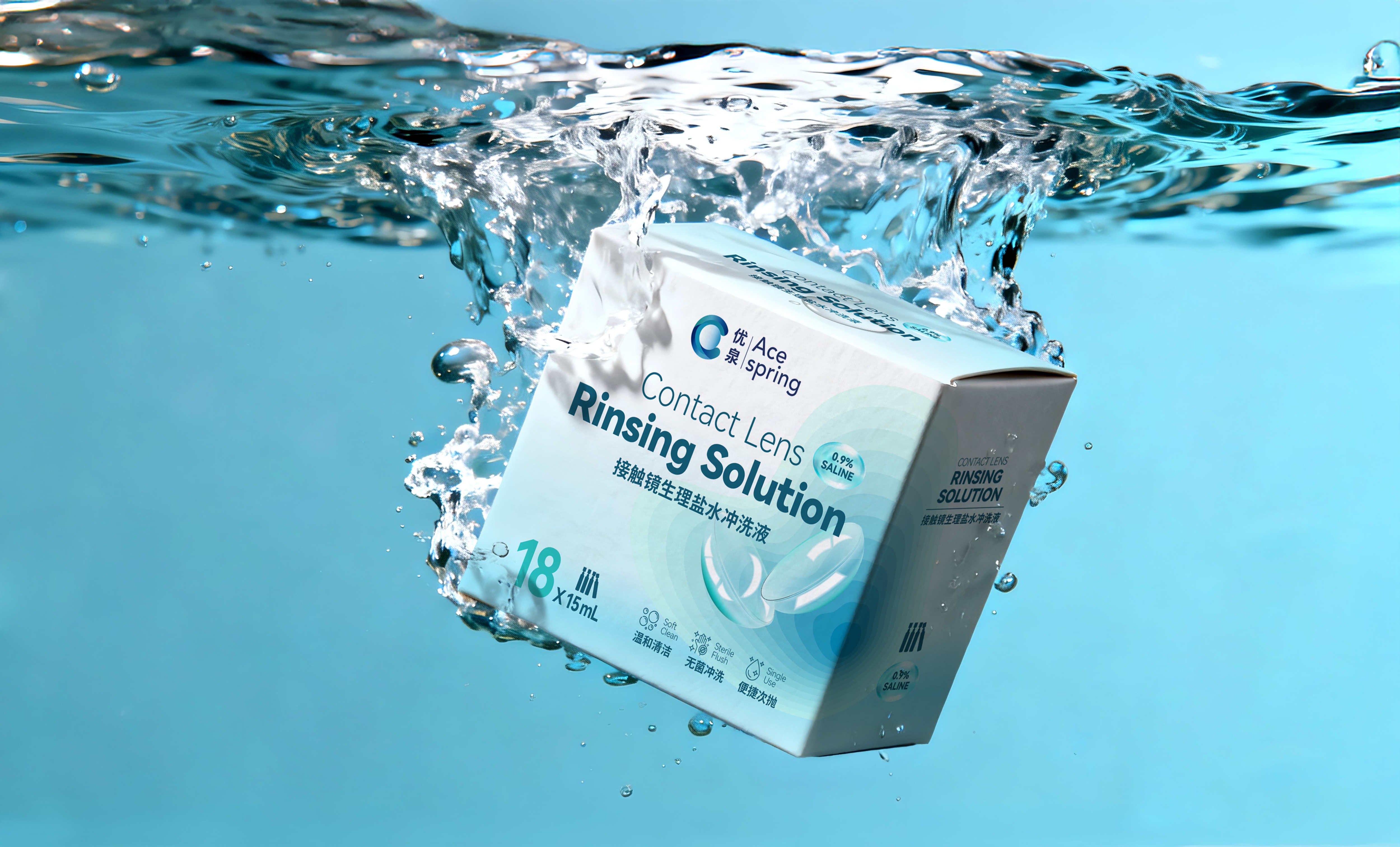 以低饱和浅蓝 + 纯净白为基底,搭配流体水滴、隐形眼镜意象,既呼应“生理盐水冲洗液” 的材质属性,又以舒缓冷色调传递“无刺激” 的感官联想,消解医用产品的生硬感。