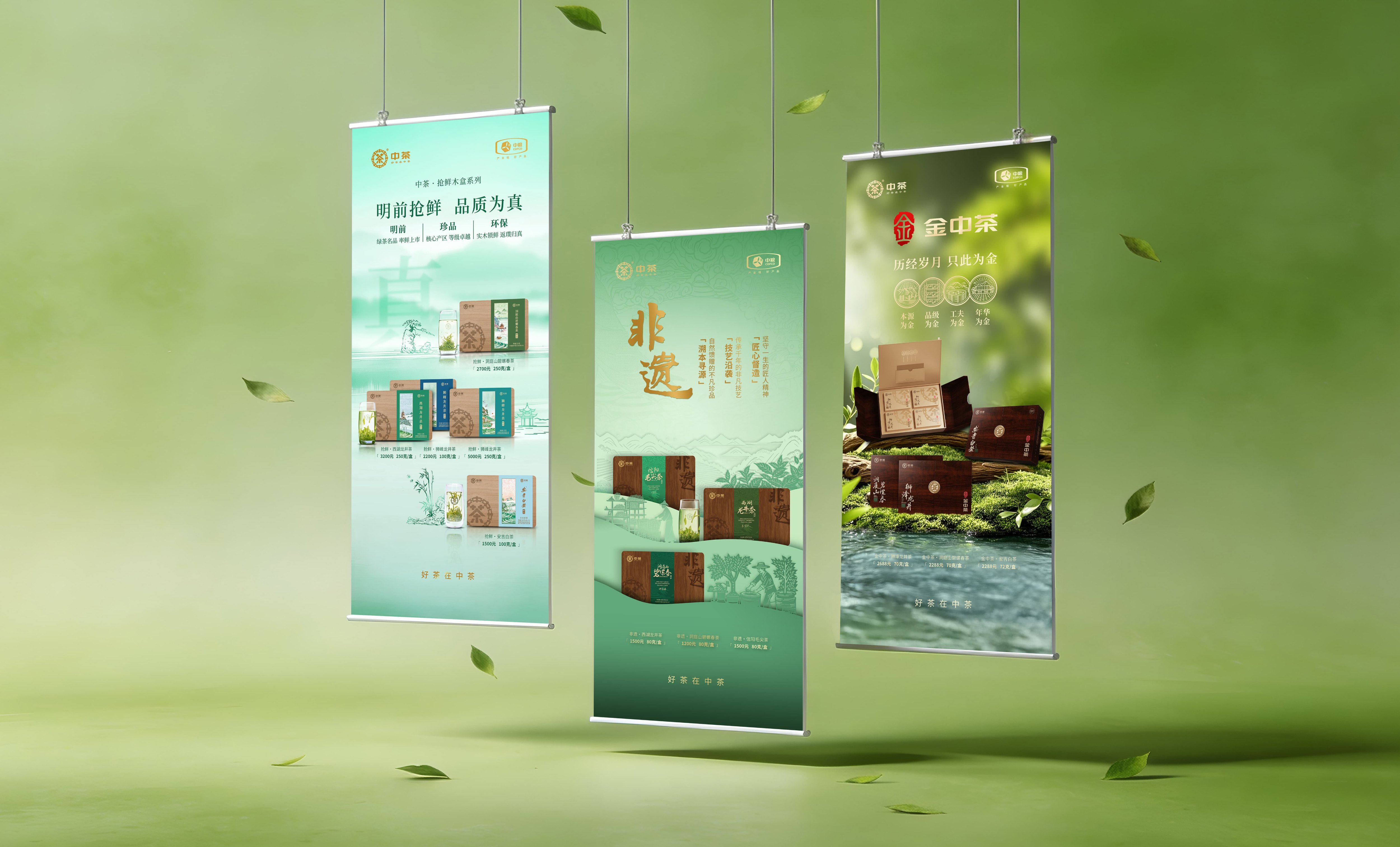 设计上,我们摒弃单一视觉符号的重复应用:色彩体系对标八马的沉稳色系与小罐茶的明快调性,却为中茶定制“品类专属色谱”,绿茶的青绿晕染、普洱的黑金叠印、红茶的红金渐变,形成比竞品更丰富的视觉层次;元素运用上,跳出八马的传统纹样堆砌与小罐茶的扁平化表达,将非遗工艺、茶山地理转化为极简线条符号,让国茶文化可视化且具当代质感;版式逻辑则兼顾八马的高端仪式感与小罐茶的场景适配性,以不对称网格平衡美感与信息传递效率。