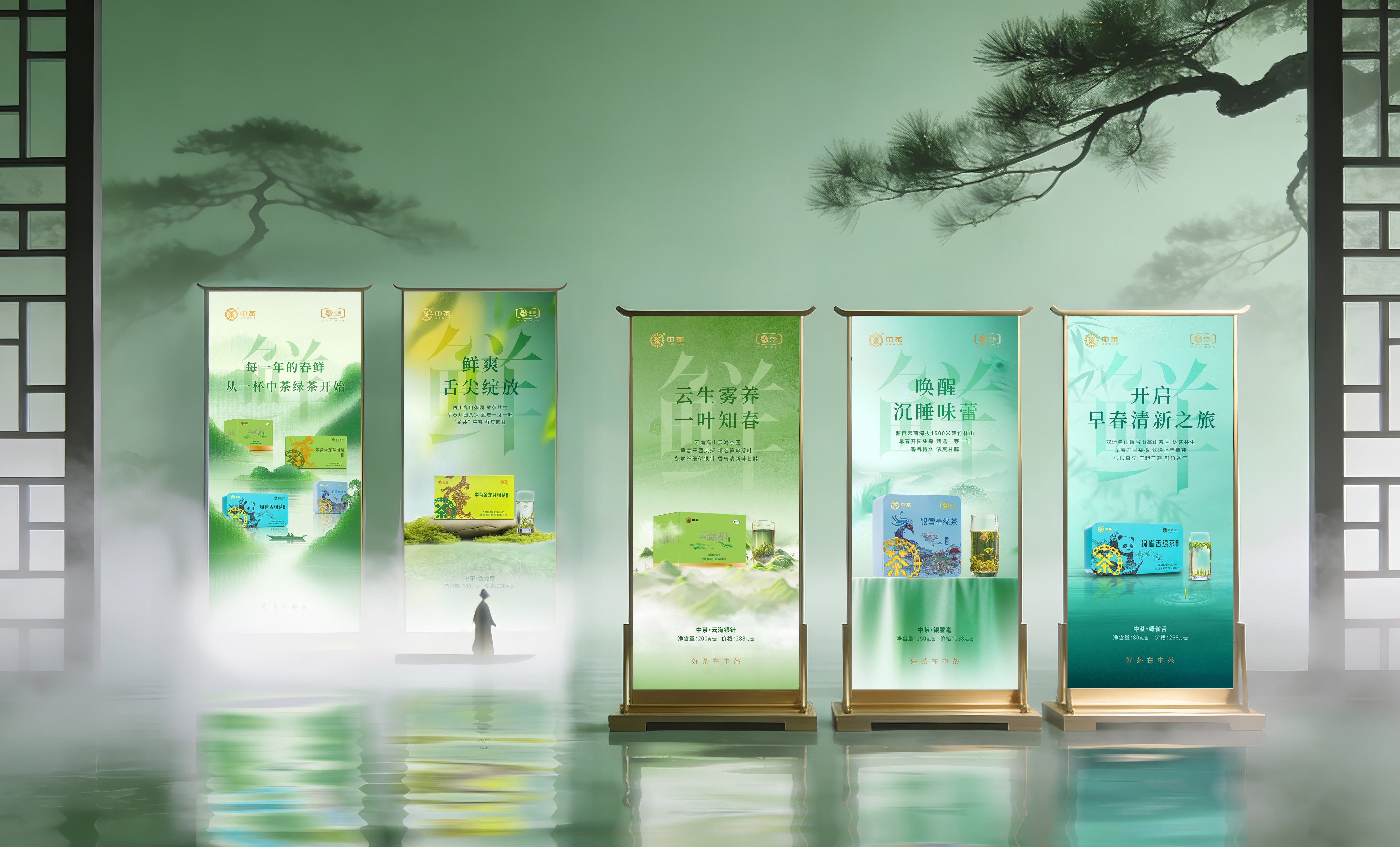 设计上,我们摒弃单一视觉符号的重复应用:色彩体系对标八马的沉稳色系与小罐茶的明快调性,却为中茶定制“品类专属色谱”,绿茶的青绿晕染、普洱的黑金叠印、红茶的红金渐变,形成比竞品更丰富的视觉层次;元素运用上,跳出八马的传统纹样堆砌与小罐茶的扁平化表达,将非遗工艺、茶山地理转化为极简线条符号,让国茶文化可视化且具当代质感;版式逻辑则兼顾八马的高端仪式感与小罐茶的场景适配性,以不对称网格平衡美感与信息传递效率。