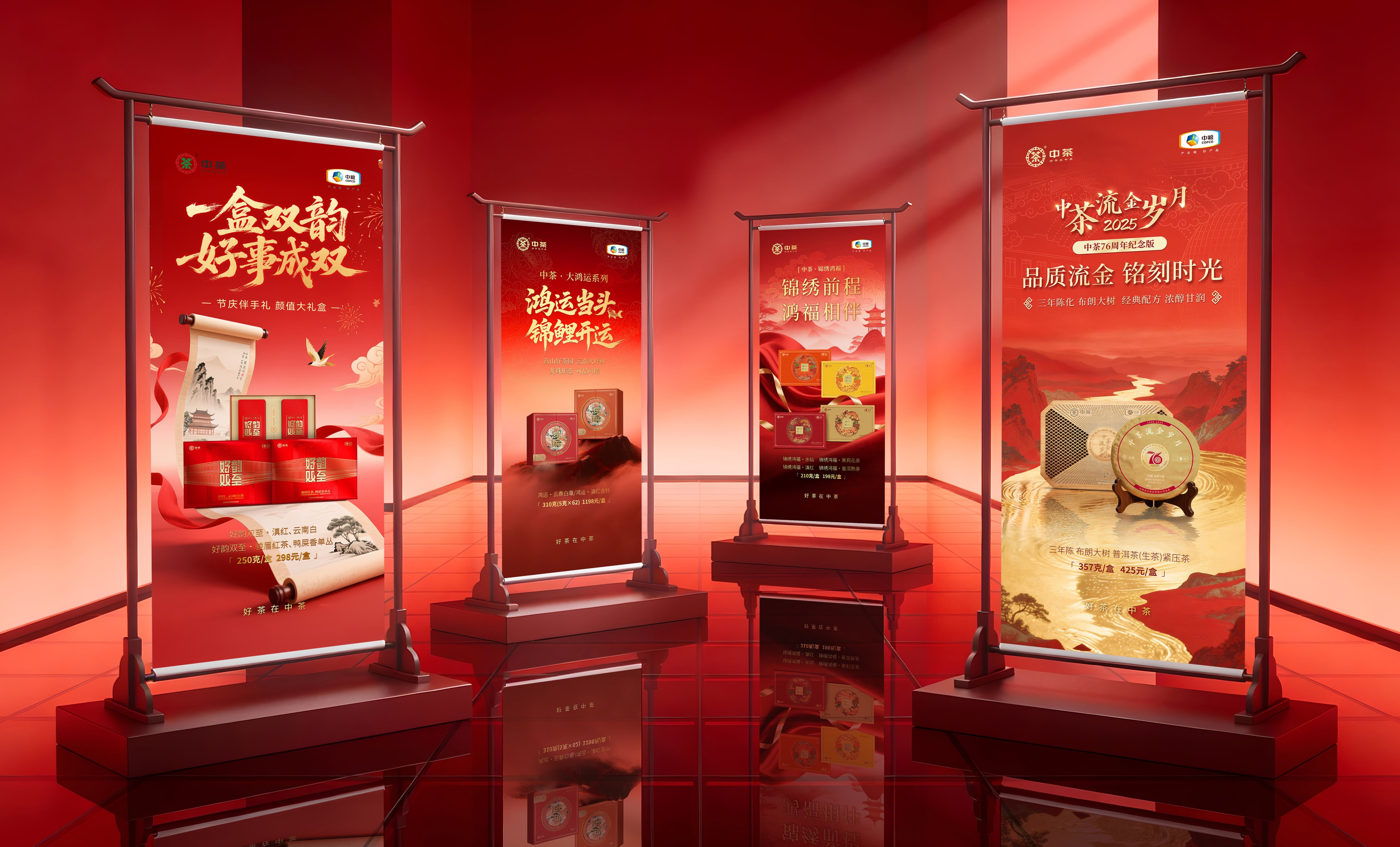 作为中茶全年产品视觉营销方案的打造者,我们以“一线品牌质感对标 + 国茶基因差异化表达”为核心,构建兼具市场竞争力与品牌辨识度的视觉体系。对标八马的经典商务设计、小罐茶的现代快消视觉,我们既汲取两大品牌在色彩聚焦、版式规整上的设计精髓,又深挖中茶“国茶底蕴 + 全品类布局”的核心优势,实现风格同频而价值独树。